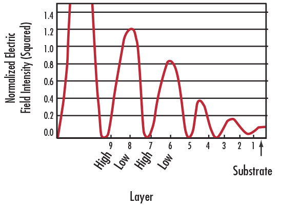 电场强度(EFI)的峰值频繁出当今膜层的界面处,尤其是最接近空气边界的层。颖异的镀膜联想师解析过修改最外层(举例九层堆叠中最接近空气的四层)的厚度,将高强度共振峰值的位置从脆弱的界面,革新到毁伤阈值最高的薄膜材料里面。
