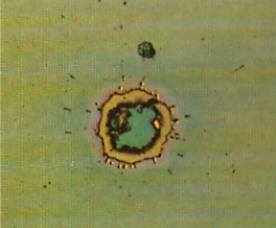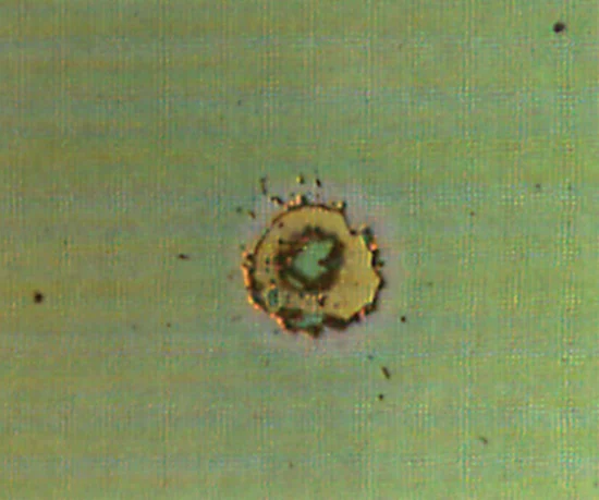 图1c: 在使用14.3 J/cm²的20ns 脉冲(光源波长为 1064nm)时因经过限度欠安而产生的镀膜故障